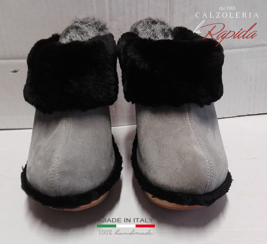 Materiale: Sabot donna in pelle grigia scamosciata, con calda pelliccia nera. Possibilità di personalizzazione.