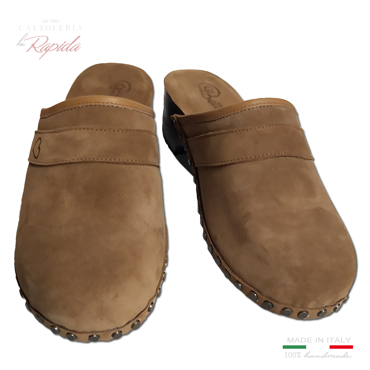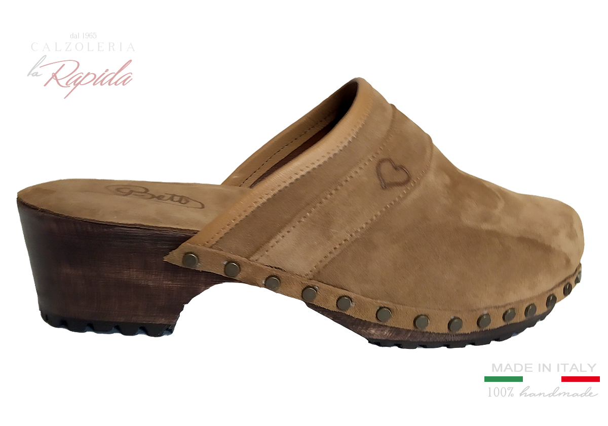 Descrizione: bellissimi clogs da donna, zoccoli stile svedesi, olandesi in legno artigianali, con fascia in pelle rivestita camoscio con decorazione a cuore.