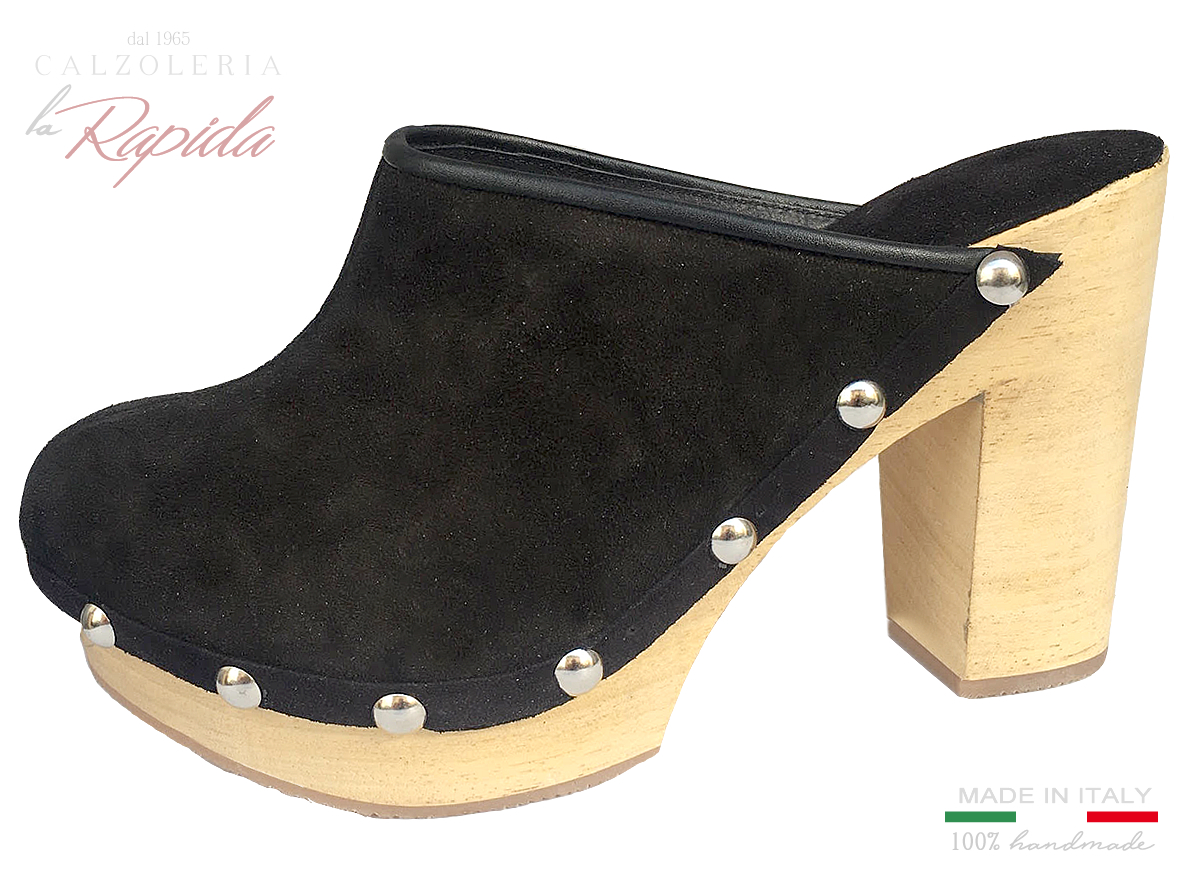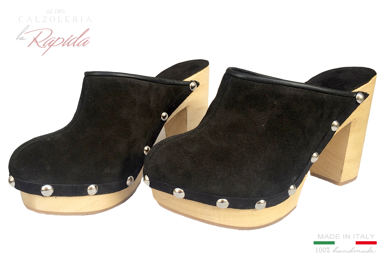 Materiale: zoccolo in legno tomaia pelle nera camoscio. Possibilità di averlo con tomaia con risvolta, e con cucitura a seconda dei gusti. Specificarlo nell'ordine nell'apposito campo note e personalizzazioni.