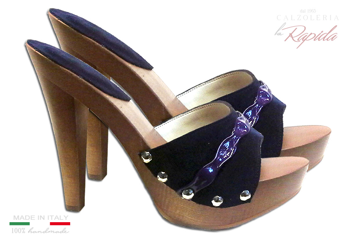 Zoccoli in legno tacco 12 fascia viola camoscio Estate 2024