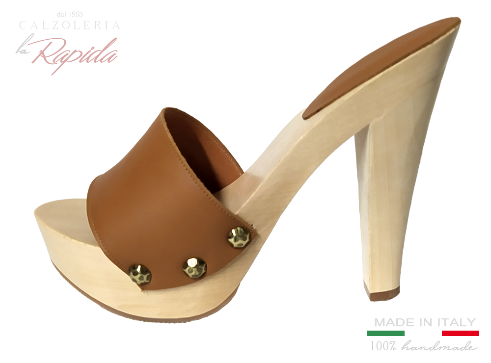 Materiale: fascia aperta in pelle naturale color cuoio, tacco fine in legno resistente. Possibilità di variazioni e personalizzazioni o cambio colore della pelle.
