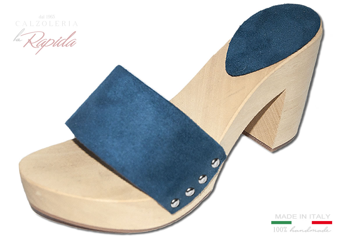 Descrizione: zoccoli donna mare azzurri cobalto color mare versilia a forte dei marmi, primavera estate 2024 in legno artigianali.