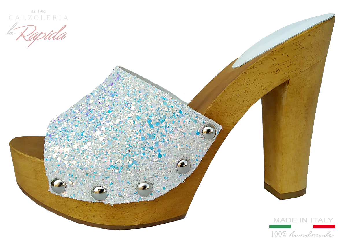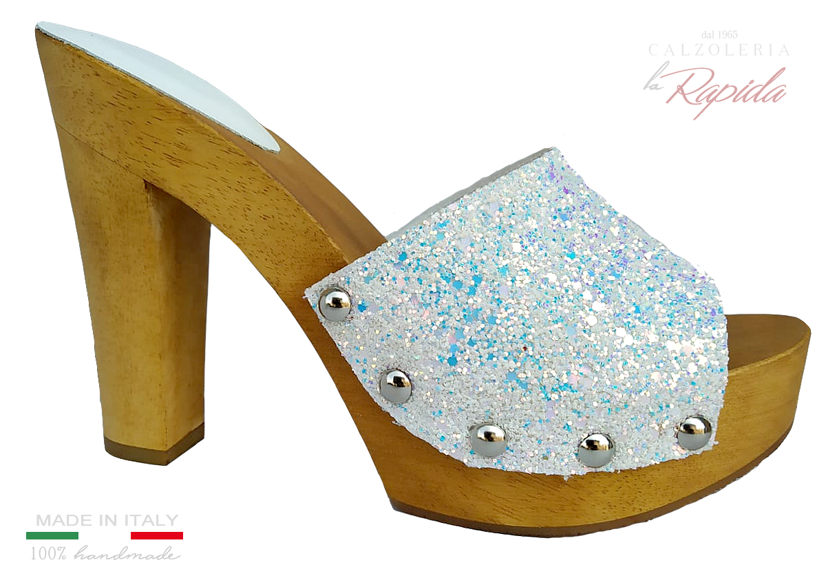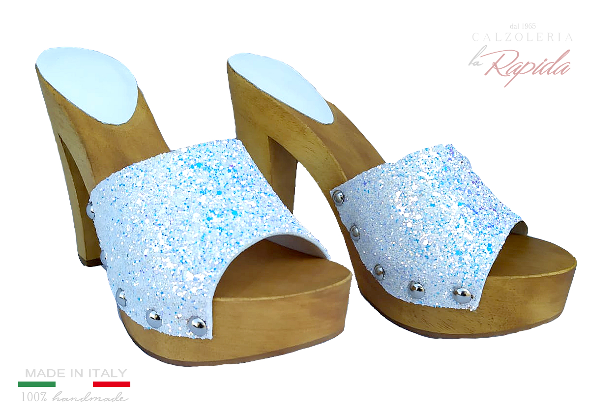 Materiale: fascia in pelle con rivestimento di graziosi glitter bianco iridescente, tacco in legno con trattamento cerato.