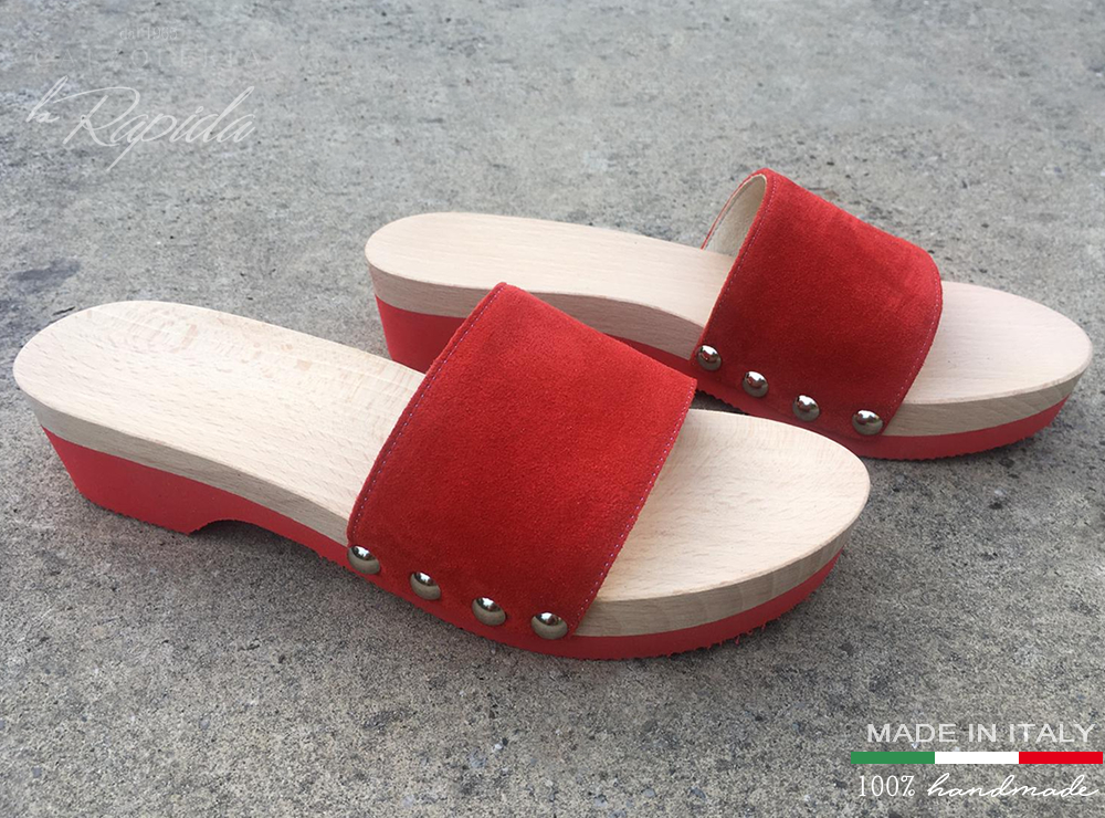 Materiale: zoccolo in legno con fondo morbido di colore rosso, fascia in pelle naturale color rosso e borchie eleganti argentate.