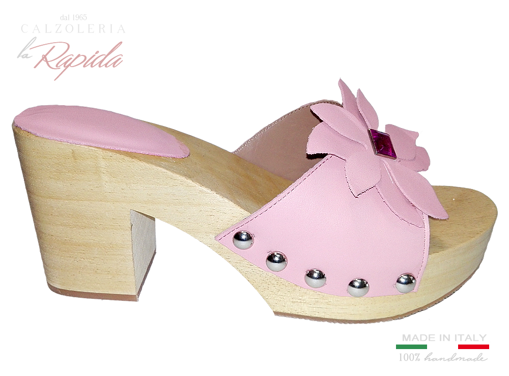 Materiale: zoccolo in legno tomaia in pelle rosa con decorazione floreale