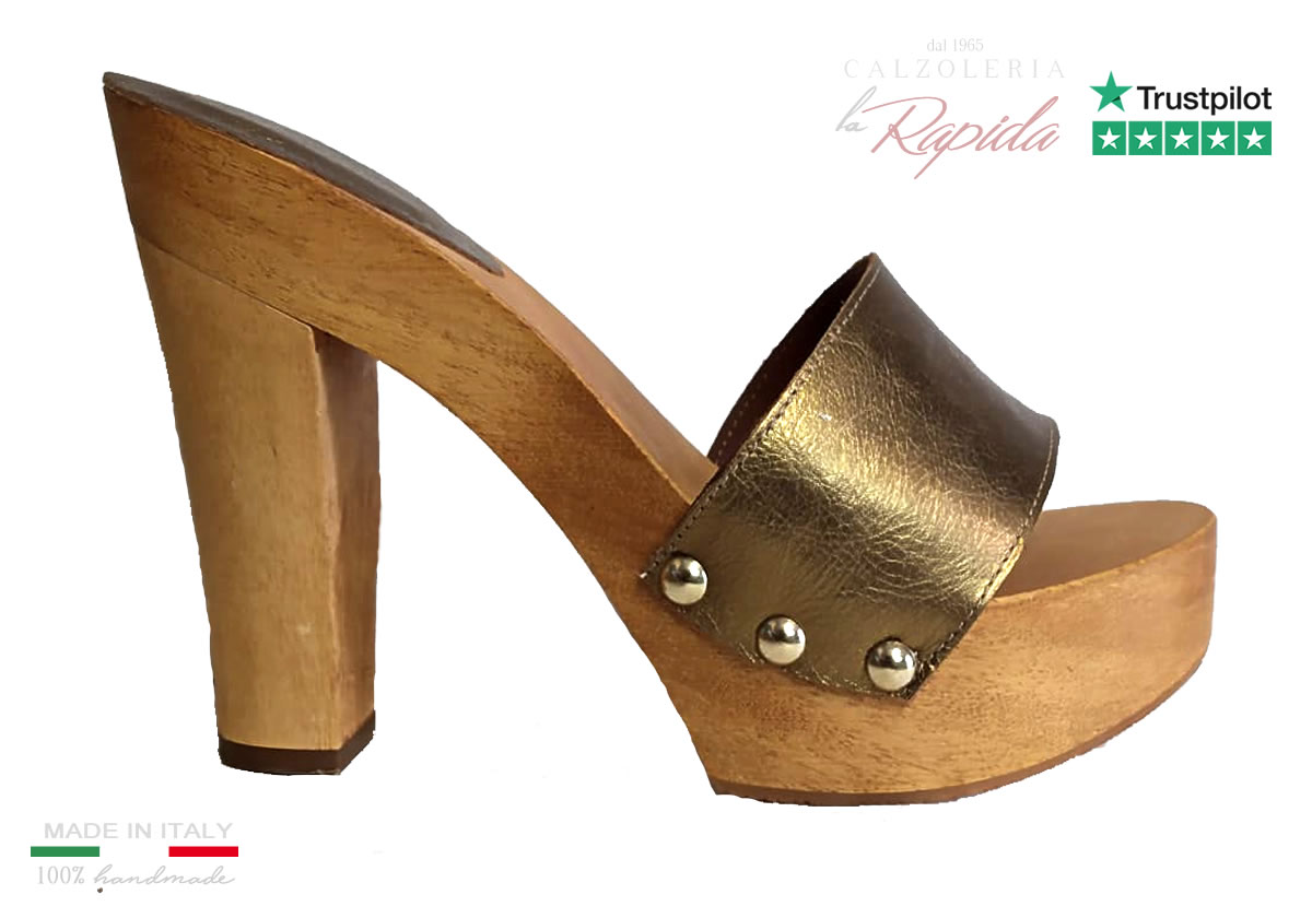 Descrizione: zoccoli in legno clogs tendenza 2024 bellissimi, eleganti in pelle bronzo, donano un tocco di eleganza glamour con uno stile semplice e minimale.
