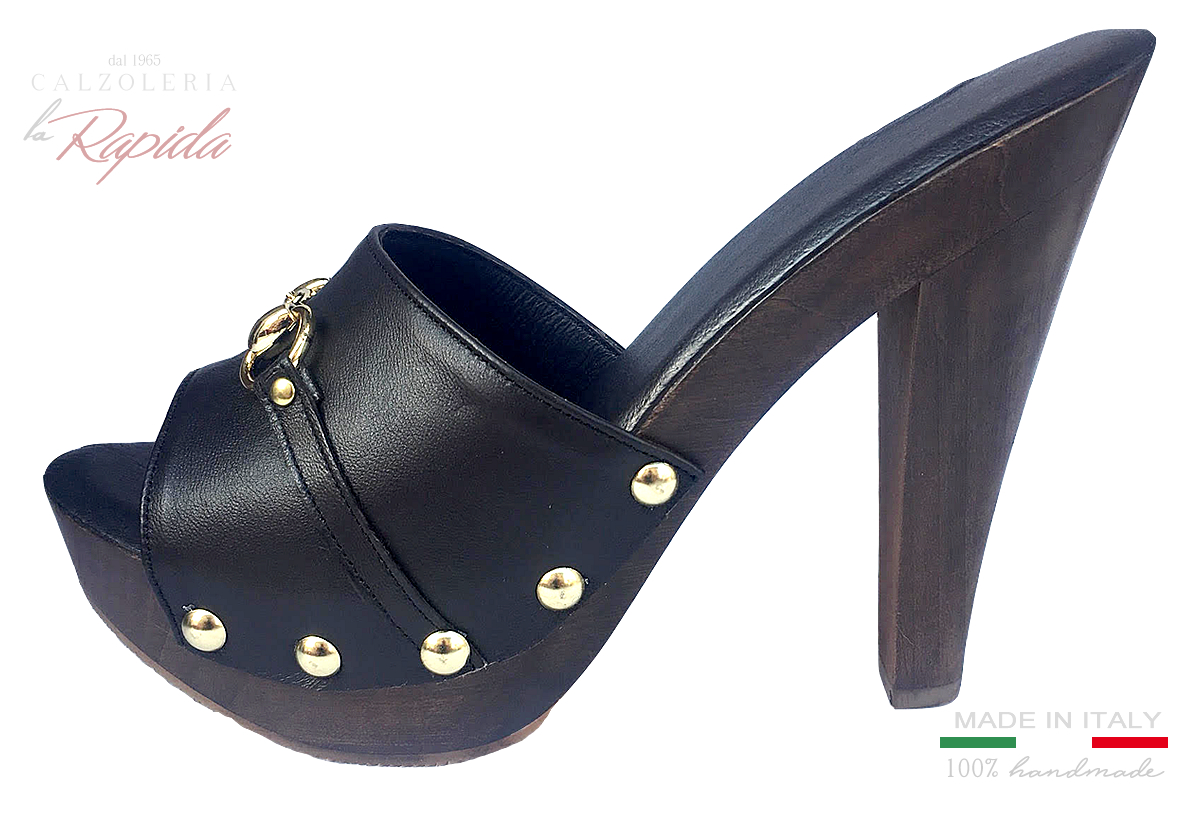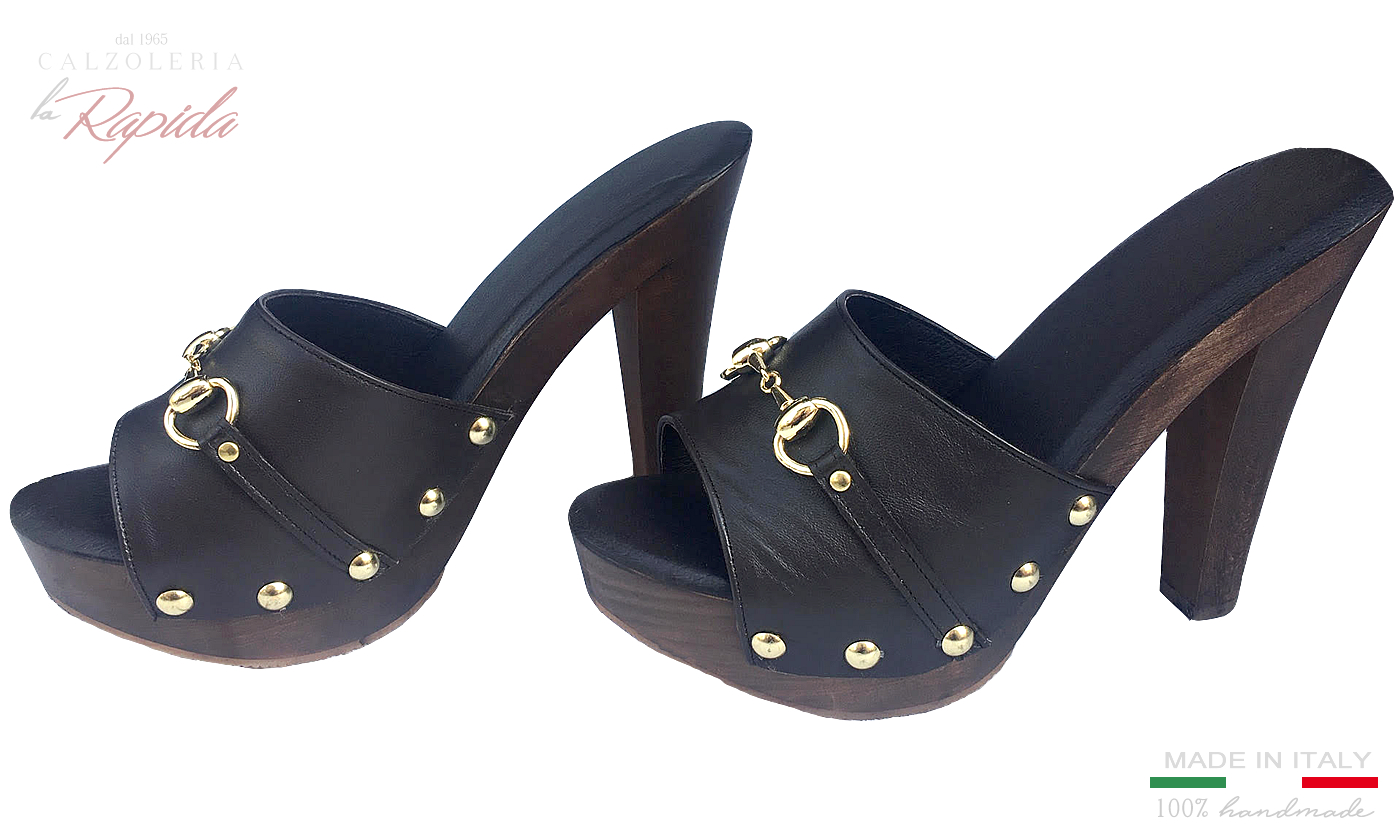 Materiale: zoccoli in legno verniciato spazzolato, con pianta imbottita in pelle morbida e fascia con decorazione gioiello colo oro.