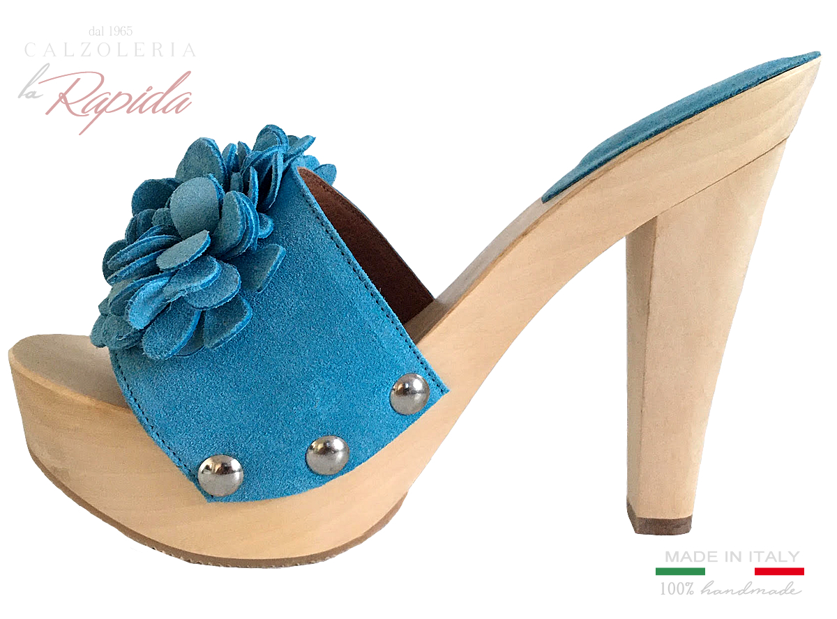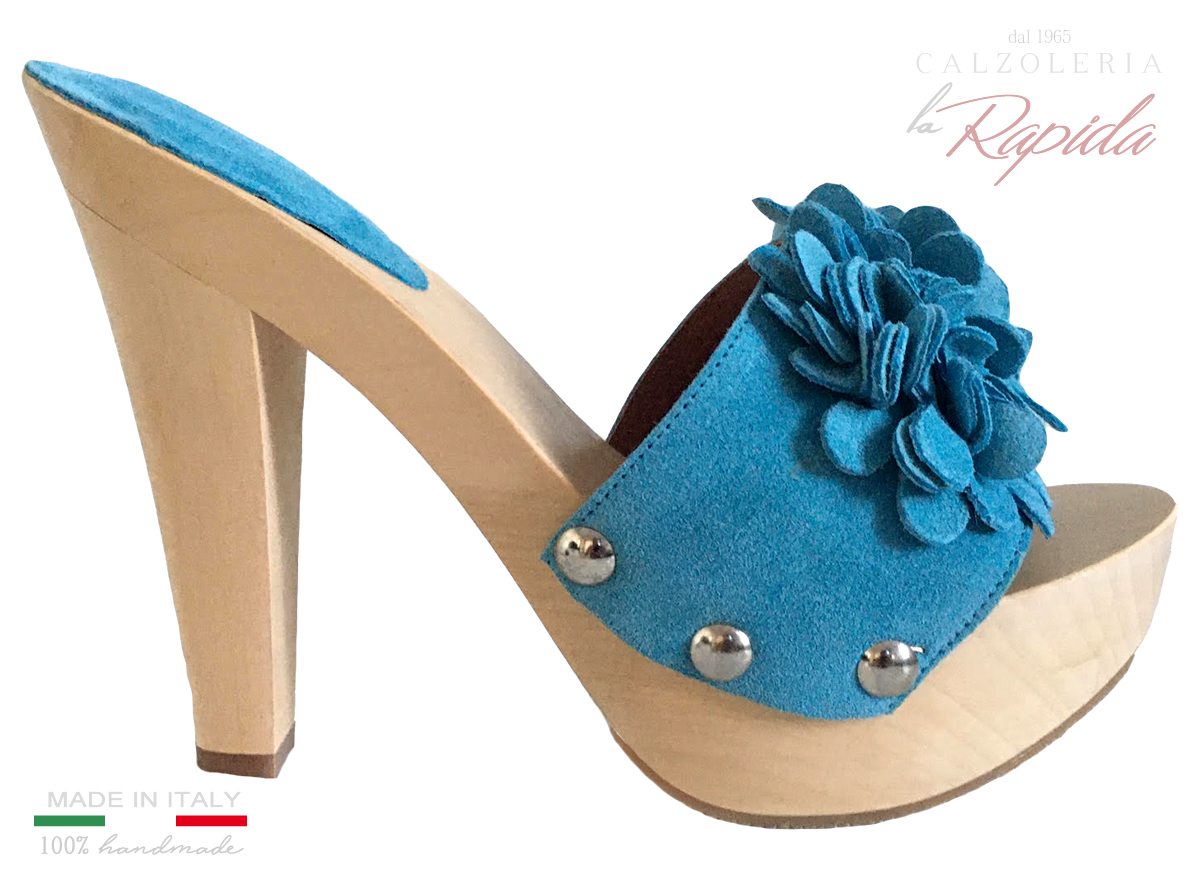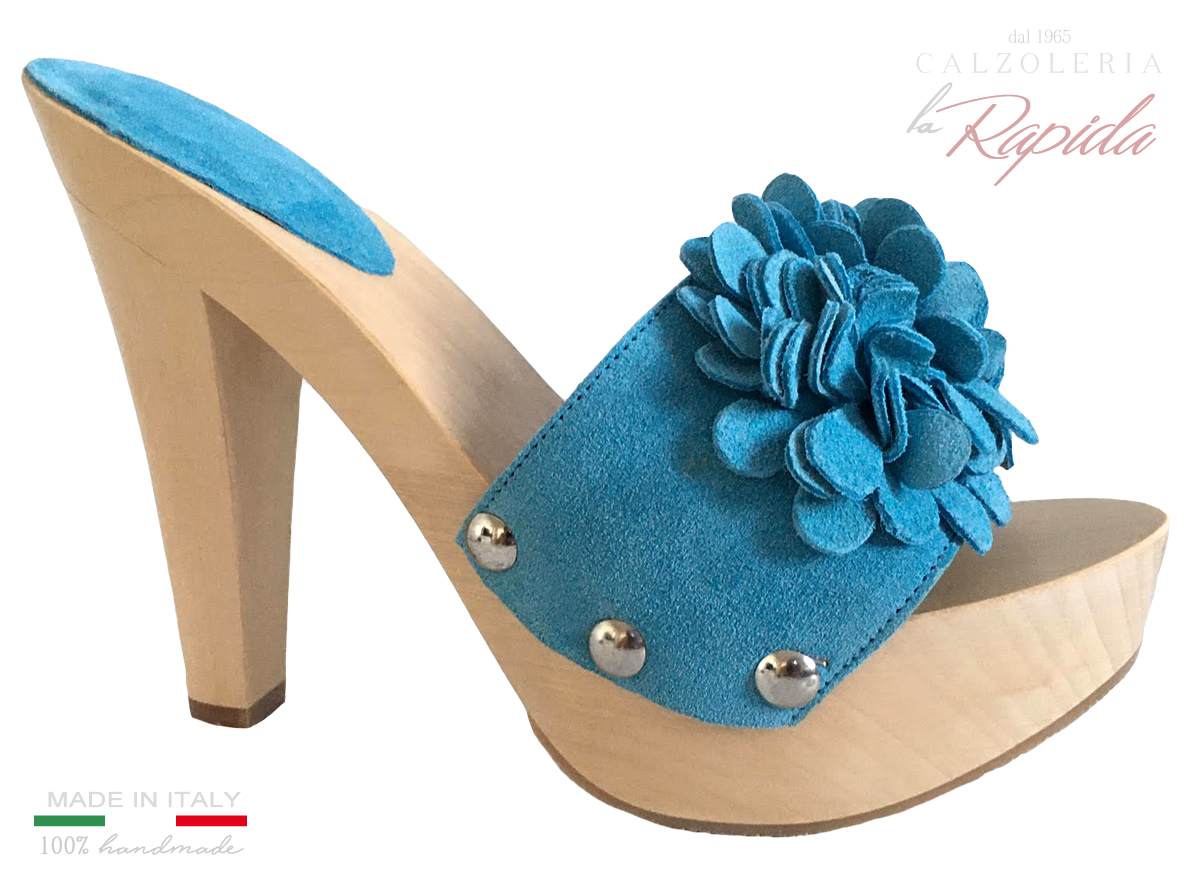 Zoccoli Donna in pelle camoscio azzuarra con fiore