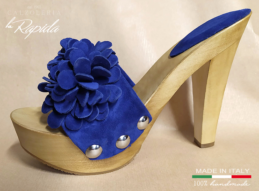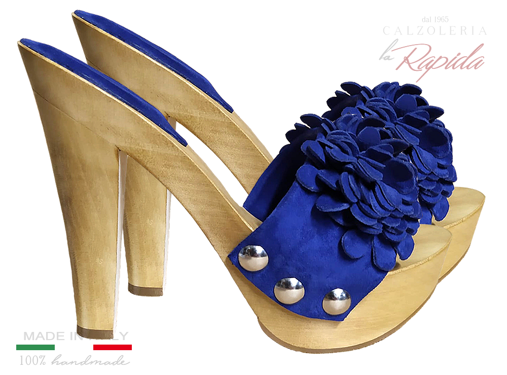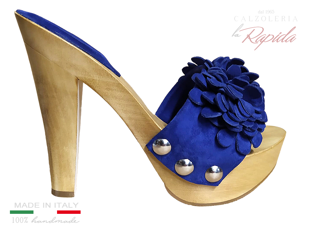 Materiale: fascia in pelle scamosciata blu cobalto, con 3 eleganti borchie argentate, decorazione con fiori che riprendonpo il disegno dell'ortensia, intrecciati a mano. Fondo in legno resistente con trattamento cerato.