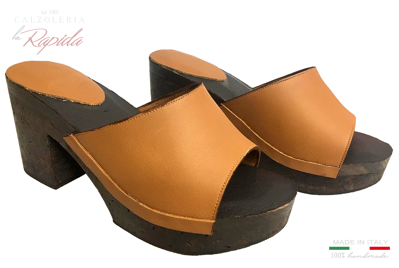 Materiali: tomaia in pelle cuoio naturale, con fondo in sughero verniciato (possibile anche lasciarlo in sughero naturale) con tacco medio.