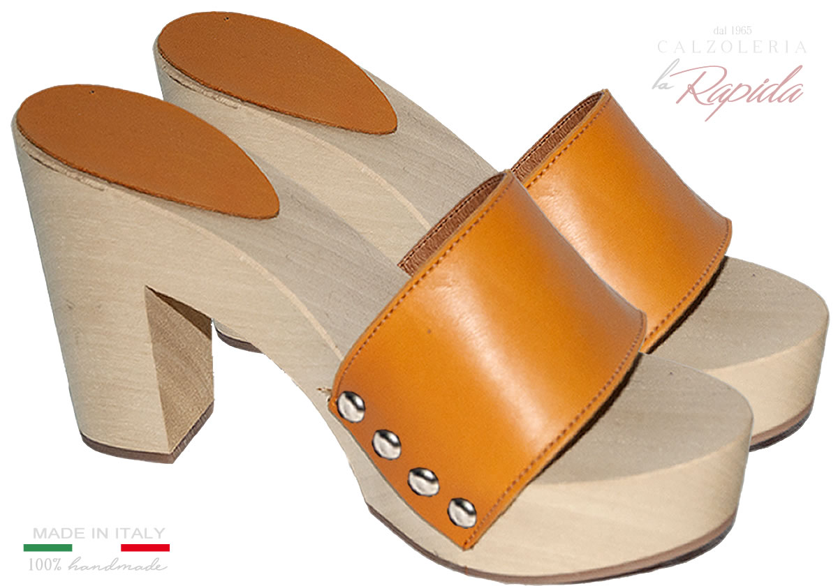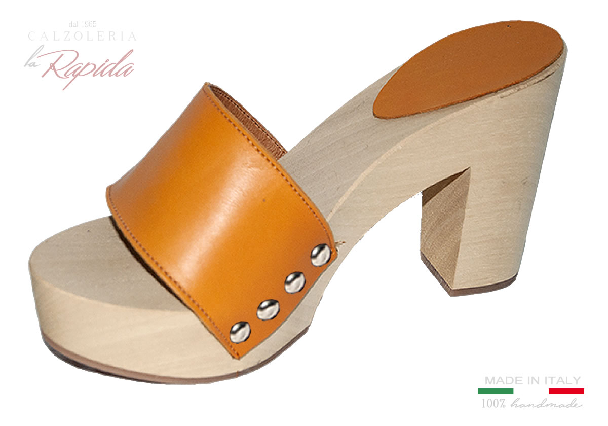 Descrizione: zoccoli con tacco da donna artigianali, arancioni in pelle, e tacco 10 cm in legno. Collezione Primavera Estate, zoccoli e sabot a forte dei marmi in versilia.