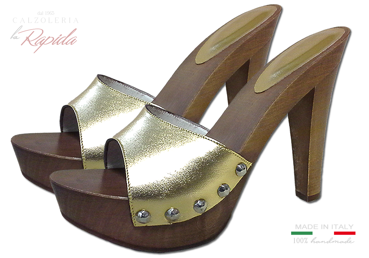 Descrizione: bellissimi ed eleganti zoccoli da donna estate in legno artigianali, con fascia oro in pelle tacco alto elegante.
