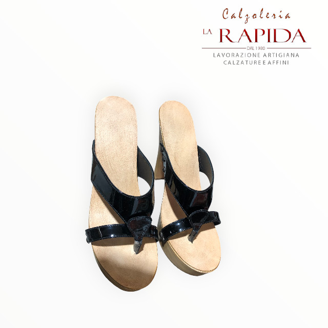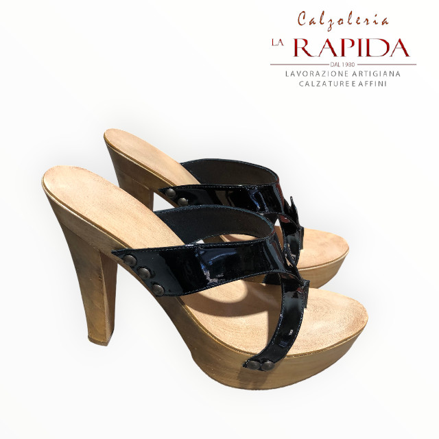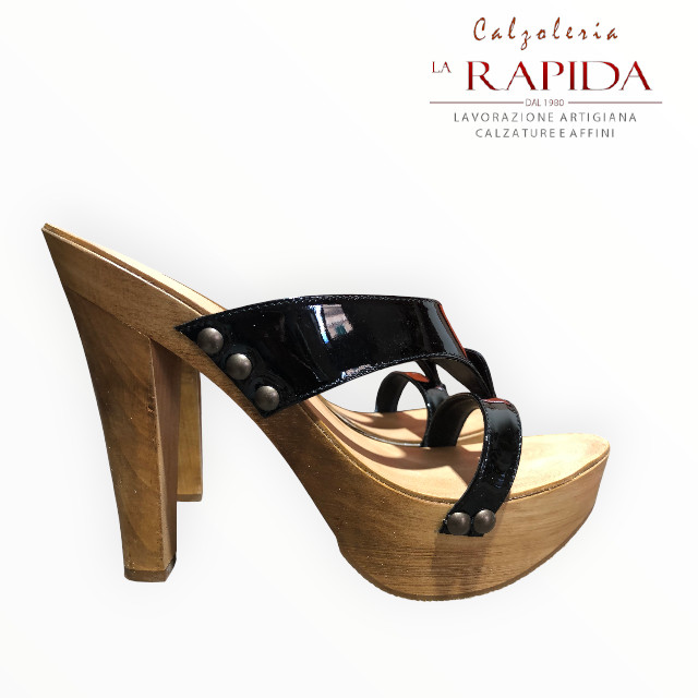 Zoccolo in legno verniciato a cera, tomaia a infradito in vernice pelle nera,