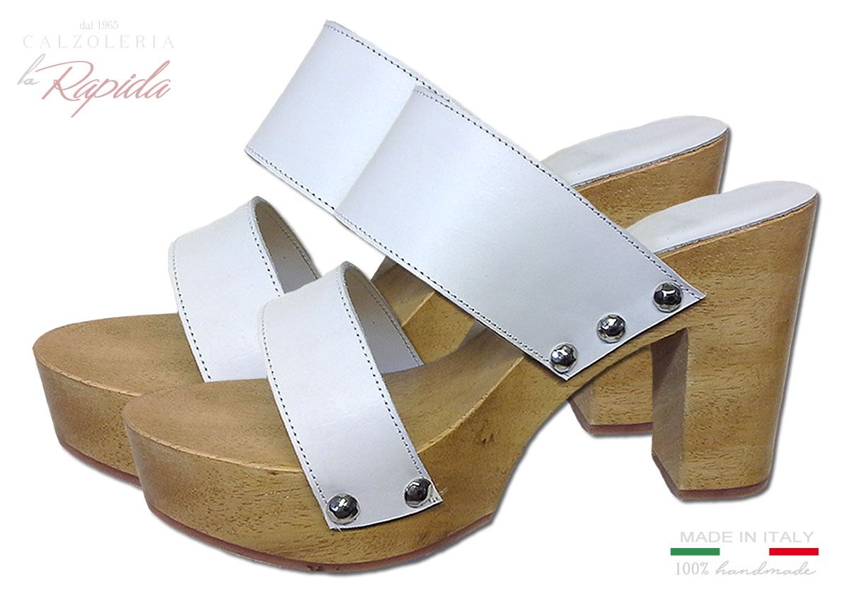 Materiale: doppia fascia in pelle bianca tacco in legno naturale resistente