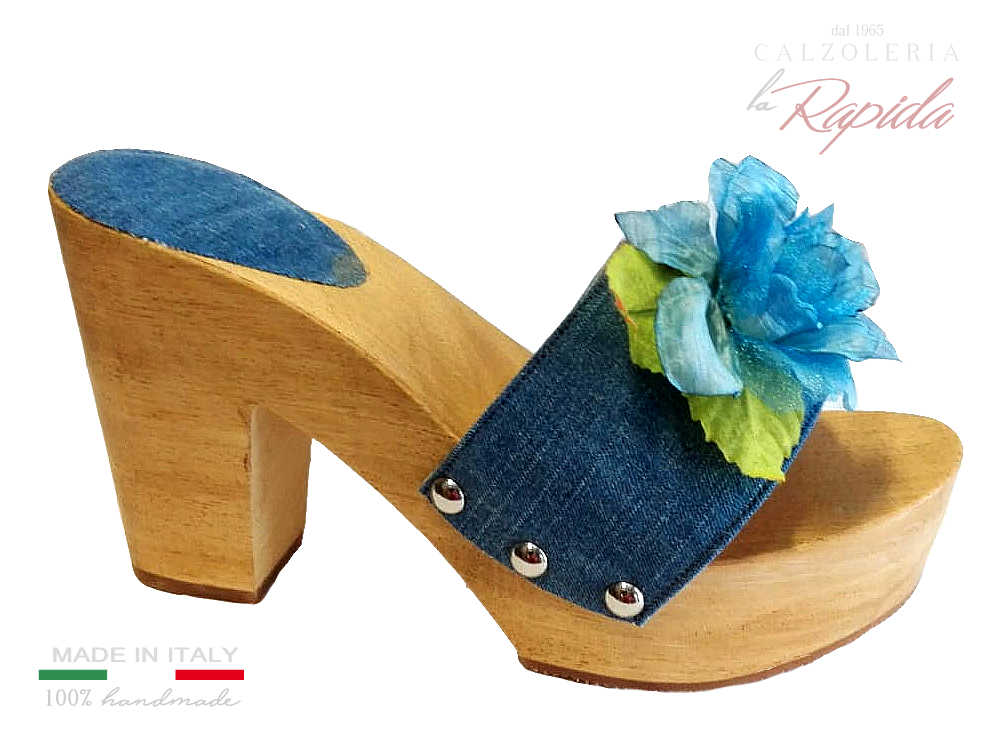 Materiale: legno Zoccoli donna tacco medio con fascia in jeans e decorazione floreale.