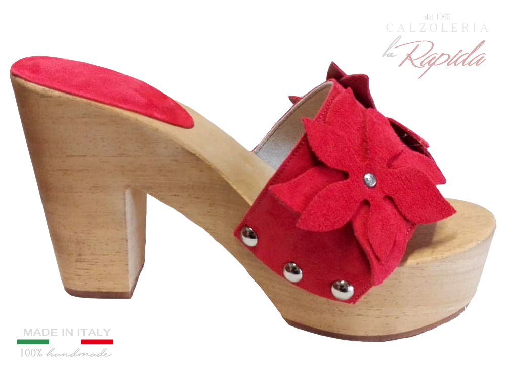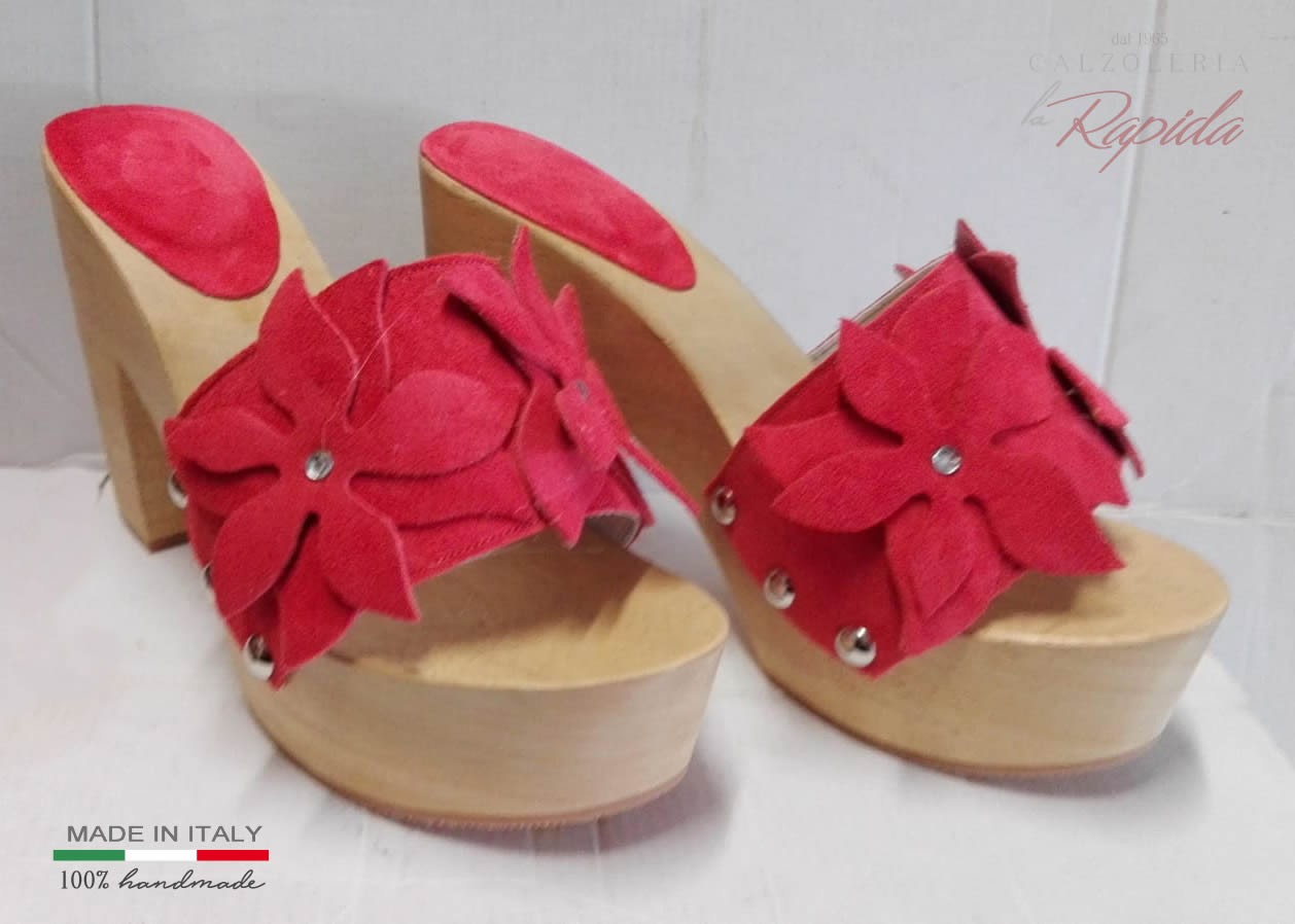 Materiale: zoccolo in legno tomaia in pelle scamosciata colore rosso, con decorazione floreale. Colori a scelta su richiesta.