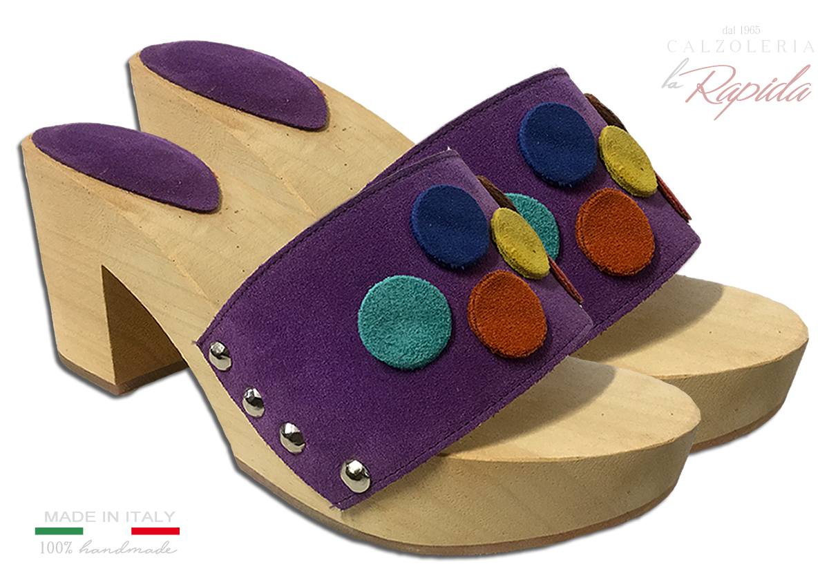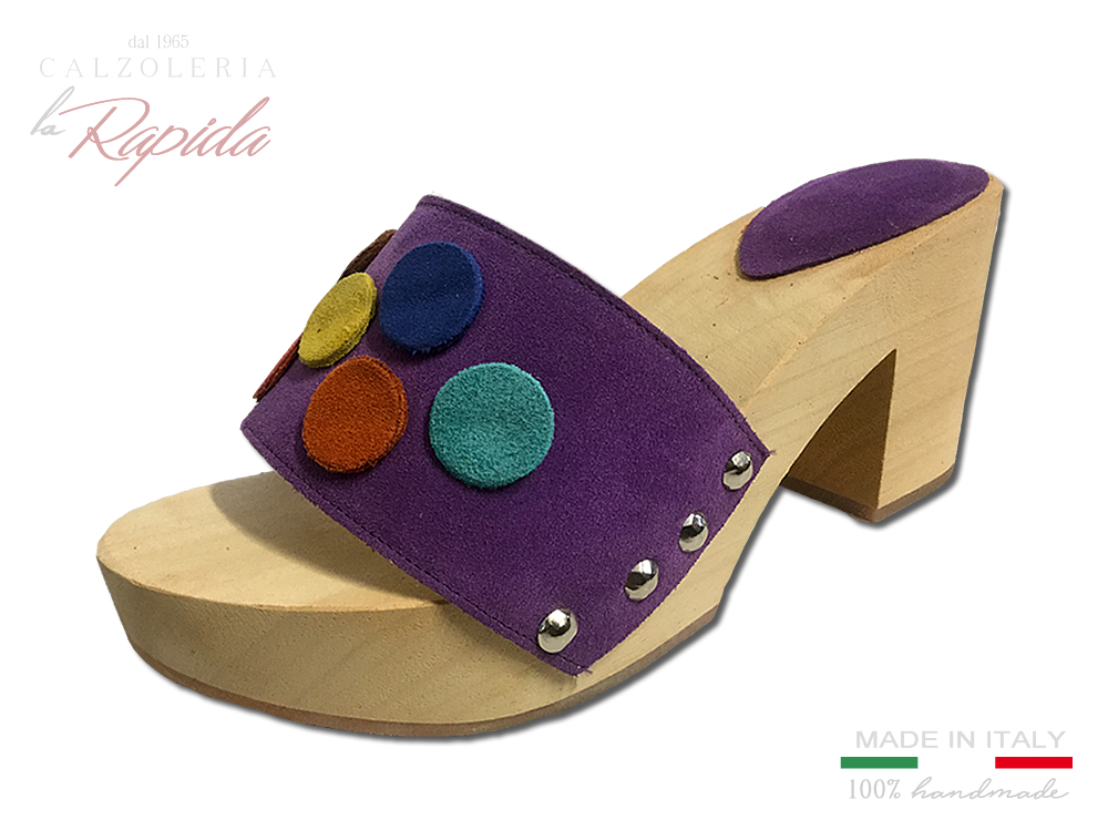 Descrizione: bellissimi ed eleganti zoccoli da mare per l'estate in legno artigianali, con fascia camoscio in vari colori.
