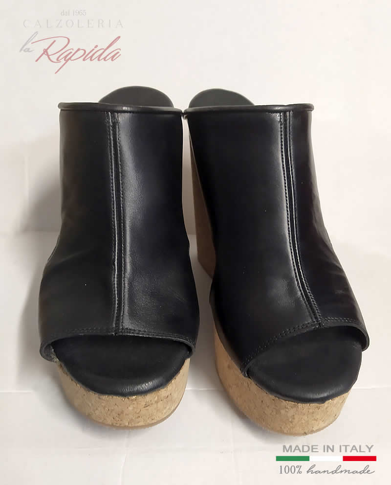 Materiale: zeppe donna alte in completo in sughero, collezione primavera estate 2024, rivestita in pelle sulla pianta, tomaia in pelle naturale colore nera.